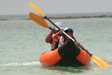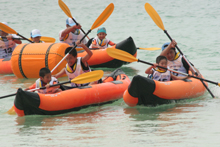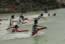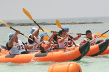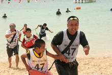 次に行われたのがB&G財団が担当した「カヌー」競技。白い砂浜が広がる「与名間ビーチ」で行いました。競技はペアカヌーにペアで乗艇し沖にある2つのブイを回って早さを競います。ペアカヌーは乗艇したペアの息が合わないと真っ直ぐに進みません。レースでは、お母さんと娘さんのペアが優勝するレースもあり、力だけではなく、ペアとの協力が不可欠な競技です。