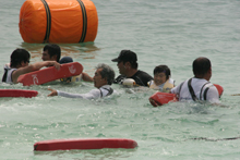 最後の種目は、日本ライフセービング協会が担当した、「バディーレスキュー」競技。カヌーと同じ水面で行われ、沖で待っている子どもをペアの方が砂浜からスタートして救助し、一緒に戻ってくるレースです。レスキューチューブと呼ばれる救助用具をペアの体に巻き、泳いで砂浜を目指し、ペアが一緒にゴールに駆け込んでくる姿が印象的でした。お父さんに救助してもらって嬉しかったと話す参加者もいました。