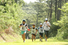 まず初めに行われたのは、日本トライアスロン連合が担当した「ペアマラソン」競技です。高橋尚子さんも練習を行った「クロスカントリーコース」を会場に親子がそれぞれペアでマラソンを行います。しかし、ただのペアマラソンとは異なり、途中に目隠しゾーンがあります。親子それぞれが目隠しを行い、ペアに手を引いてもらうのですが、初めての体験でほとんどのペアがペースダウン。お互いに声を掛け合って走っていました。