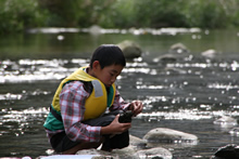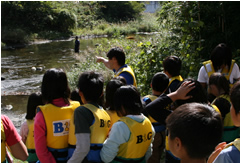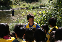 初めての一本橋 落ちないように渡ります 調査ポイントに到着し、いよいよ川に入りますが、その前に安全学習を行います。安全学習を担当するのは、B&G財団職員の持田雅成。持田は、アトランタオリンピックのカヌー競技日本代表で国内外の急流をカヌー競技で経験している川のエキスパート。その経験を活かし、急激に変化する川の特徴や、どのようなところに危険が潜んでいるのかなど、実際の川を前にレクチャーしました。