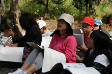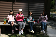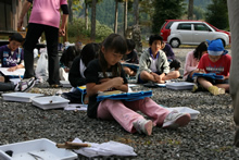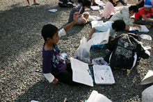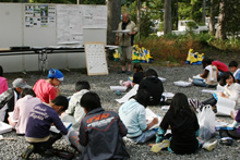 四万十川の調査を終え、学習会場を神社の境内に移し、見つかった水生生物の報告と、生物指標による新庄川との比較を行いました。