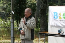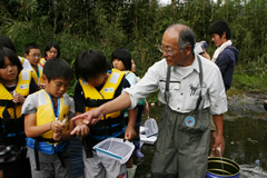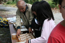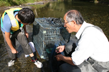 B&G財団では、地域で行われる様々な事業を安全且つ積極的に展開できるよう、各海洋センターの指導者会の組織化について支援しています。今回の授業にも指導者会から、豊田庄二さんが駆けつけてくれました。豊田さんは、B&G指導者資格の「アクア・インストラクター」を取得し、東津野海洋センターの黎明期を支えた指導者の一人で、小さい頃に、魚とりなどでこの四万十川で遊び、今でもよく川に来る「川の達人」。そんな豊田さんが、子どもたちの学習を深められるよう、川魚を獲る「仕掛けかご」や、その仕掛けにかかった魚を持ってきてくれました。