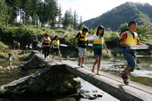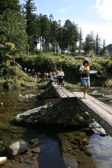 この橋こそが「一本橋」。四万十川といえば、川が増水したときに、川に沈んでしまう「沈下橋」が有名ですが、この一本橋も沈下橋と同じ考え方に基づき設置されているもの。ただし増水時には、この橋は水に流されてしまうよう設計されています。増水時に水に耐える橋を作るより、水には流されてしまうが、簡単に元に戻せる橋の方が、結果的には労力が少なく、維持管理が簡単であるという昔からの知恵。自然に逆らわず、共生する日本人ならではの考え方です。ちなみにこの橋は今でも生活道路として利用されています。子どもたちは、こんな話を聞き、実際に利用することにより学習につなげていくのも水プロの特徴です。