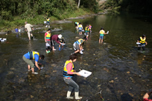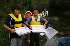 水生生物の標本を参考に、四万十川の水生生物調査を行います