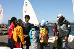 小学生のOPヨットの出艇を手伝う大学生。みんなで協力して活動をしています