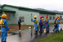 開講式の後に行われた座学では、今回の講師であるアトランタオリンピック日本代表選手の持田雅誠(財団職員)が川での注意点やセルフレスキューの方法、リバーツーリングを企画する際のポイントなどを講義。スローバック(河川での救助道具)を用いての救助法の実演も行いました。。
