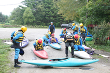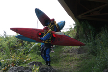 二日目は流れの速い場所に挑戦です。カヌーをかついで、川岸に降りて行きます。