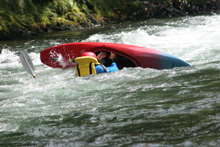 座学のあとは、いよいよ実技です。9月上旬でも北海道の水はさすがに冷たく参加者全員ドライスーツを着込んでの実技。初めに川の上から、座学で学んだ川の流れの種類や性質をおさらいした後、実際にカヌーに乗艇し、リバーツーリングの基本練習を行いました。しょには、川の流れの速さに戸惑っていた参加者も徐々になれ、最終日には、落差のある“瀬”を下ることにも挑戦。失敗して沈をした参加者もいましたが、皆さん練習の成果を実感していました。