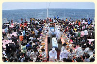 午前6時45分、今回のクルーズで初めての「朝の集い」が行われました。昨夜、船酔いに苦しんだ子もスポーツデッキで爽やかな海風をあびて元気を回復。皆でラジオ体操をして体を整えました。 | |