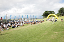 競技の開始時間となる9時近くになると、会場のクロスカントリーパークには、参加者が続々と集まってきました。当日の天候は、後の台風4号となる熱帯低気圧の影響を受け不安定。しかし、開会式では雲間から光が差し込み、どうにか天気はもちそうです。美しく整備された芝生の上で開会式。地元から参加した坂元さん親子の選手宣誓で、南の島の熱い一日の幕開けとなりました。