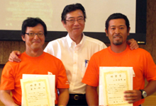 アクアで教官賞を受賞した、(左から)石川県志賀町富来の谷場宣彦さん、鹿児島県天城町の吉田武久さん