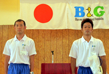 功労賞を受賞した、(左から)鹿児島県いちき串木野市の東幸一郎さん、沖縄県本部町の小浜直重さん(中央はB&G財団古山)