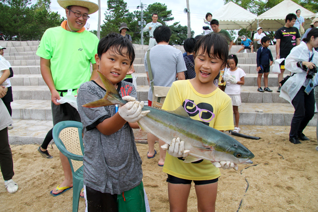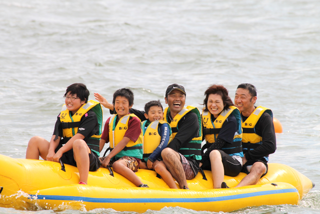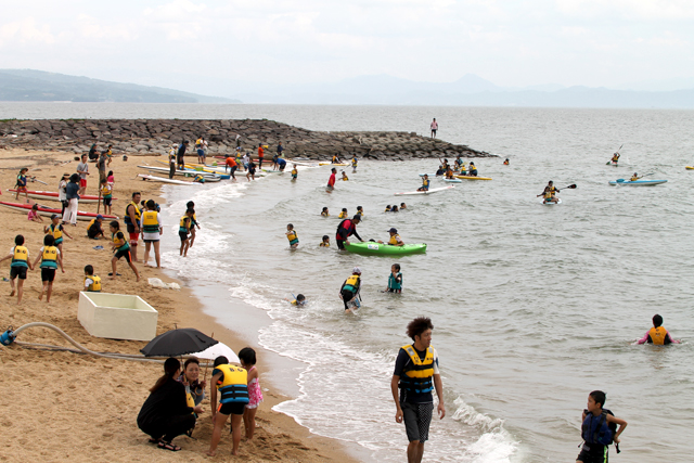 | 概要 | 菊池市班蛇口湖ボート場(竜門ダム)に引き続き、10月8日(土)に熊本県宇城市若宮海水浴場おいて、197人の方々にご参加いただき「がんばろう熊本!B&Gフェスタ in 宇城市」を開催しました。 事前の天気予報では、「曇り後雨」で降水確率も高い確率となっていましたが、当日は太陽が顔を出し、朝のセレモニーから多くの方々が来場。オフシーズンの海水浴場で、マリンスポーツを楽しんでいただきました。 今回も、カヌー・SUP・バナナボートを準備しました。参加者からは、「SUPもカヌーも初めての体験で、なかなかうまく乗れないが、とても楽しい。」との声をいただきましたが、イベントが進むにつれ、波も高くなり、うねりも伴うようになり、雷注意報も発令されたことから、安全面を考慮し、体験会は午前中で終了としました。 午後は抽選会とお楽しみコーナーを実施。砂浜を掘り、ビニールシートを被せ、即席の海水プールを設置し、「魚のつかみ取り」を行いました。水槽には鯛やハマチ、ワタリガニなどを放流。子供たちがプールで魚を追いかけると、外野からは「鯛を取れ!」などの声援が飛ぶなど、大いに盛り上がったイベントとなりました。 |