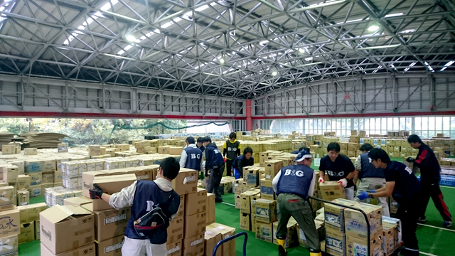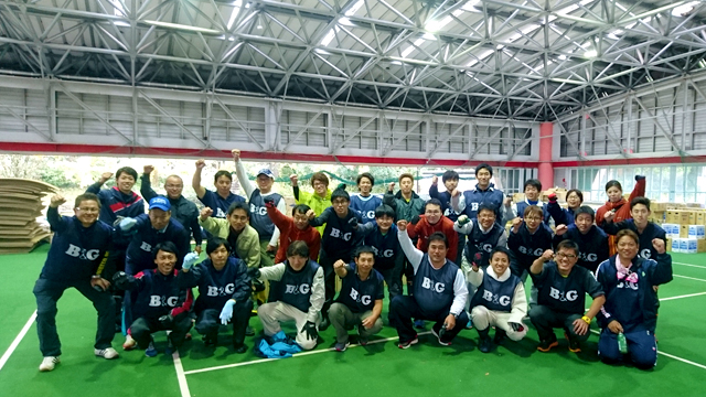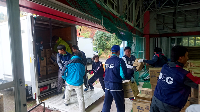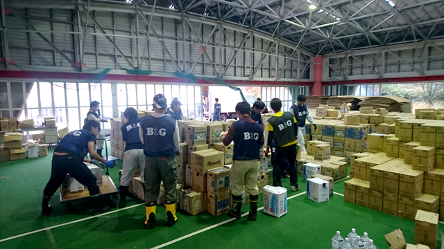 | 概要 | 第3回目となる「がんばろう熊本!」B&G指導員ボランティア派遣事業を実施し、長野・島根・山口・福岡・熊本・長崎から24名の指導員の方々にご協力をいただきました。 今回は南阿蘇村にある屋内体育施設にて作業をしました。施設一面に支援物資が集積されていますが、震災前のこの施設は本来、スポーツの場であり、リフレッシュの場でした。村民の方々の生活を再び取り戻すために、10キロ以上ある「水」の支援物資を次々に搬出するかなりハードな作業でしたが力を込めて行いました。 震災から約7ヶ月が経ちましたが、被災地では今も倒壊した家屋が目立ち、多くの方々が仮設住宅で先の見えない生活を過ごされています。それでも被災者の方々は困難に立ち向かい、前を向いて新しい歩みを始めていらっしゃいます。 そんな中で私たちにできることは「被災地のことを知ること」だと思います。ボランティアでなくても、実際に被災地には行けなくても、熊本が元気になる手助けをすることができると思います。引き続き、皆さまのご協力のほどよろしくお願いいたします。 (事業課 宍戸) |
