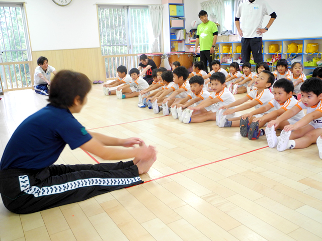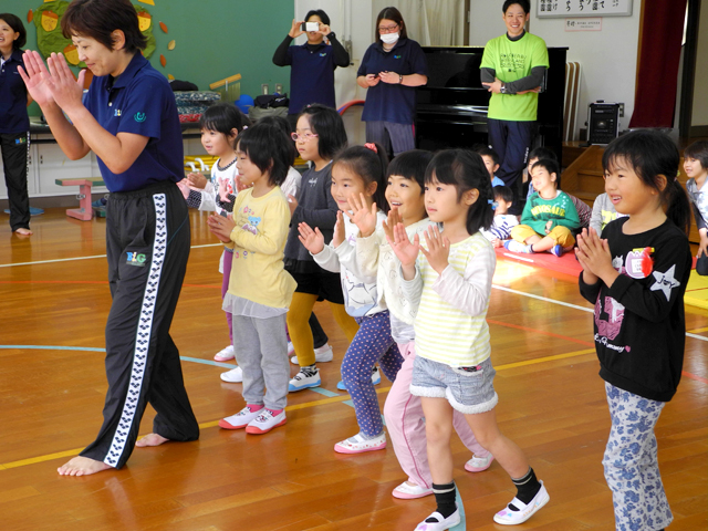 | 概要 | 熊本地震により被災した熊本市南区城南町において、計4ヵ所の幼稚園・保育園児を対象に、B&Gフロアリズム運動教室を実施した。音楽やリズムに合わせて楽しく体を動かすことで、心身のリフレッシュを図り、笑顔と元気を取り戻すことが期待できる。 熊本市内の復興への道のりはまだまだ険しく、子供達への心身のケアが課題となっている。 当日は総勢142名の幼児が参加。熊本県内所在のB&G海洋センターに勤務するB&Gインストラクター10名(長洲町2名・南阿蘇村2名・玉名市1名・宇城市1名・南関町1名・あさぎり町1名・美里町1名・湯前町1名)もサポートに駆けつけて事業を支援した。 |