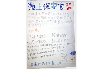 海上保安官の仕事を「生命を救う」「領海を守る」「災害に備える」「青い海を守る」の4つの分野に分けて説明しました。どの海上保安官の方も人を守りたいという熱意があった等、海上保安官から感じたことを報告しました。最後には、みんなに伝えたい合言葉として「未来に残そう 青い海」と班全員が声を揃えて訴えました。