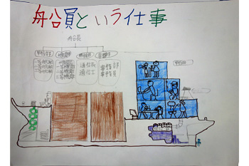 船員の仕事の内容や船外で活動する際の動きやすい服装等について説明しました。また、体験学習を通して、船員はコミュニケーション能力や相手を気遣うことが必要で、協力し合うことが大切であると報告しました。