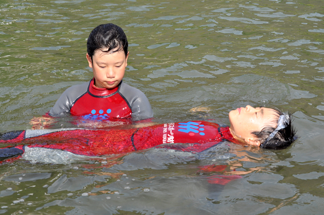 水に落ちても慌てない! バディ(仲間のペア)と一緒に背浮きの方法を学びました