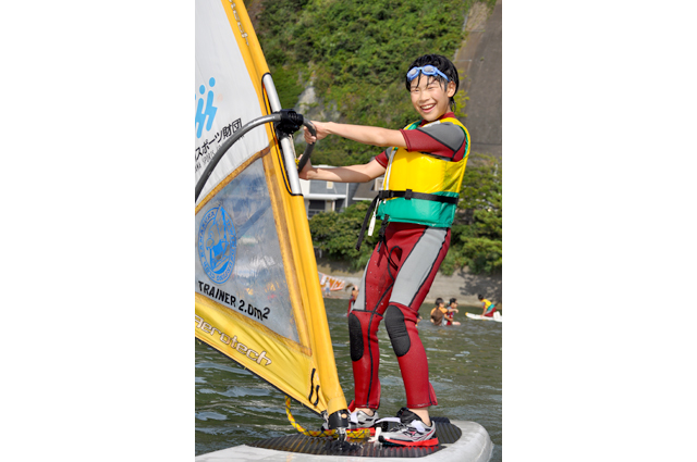 ウインドサーフィンの構造や艤装(パーツのフィッティング)を説明するほか、SUP(スタンド・アップ・パドルボード)に乗ったときの感想を楽しく解説。水に落ちたときは慌てず、背浮きを行って助けを待つといった水辺の安全知識も紹介しました。