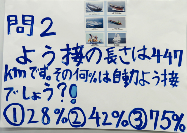 「船の馬力はバイクの3000倍」「造船の溶接は75%が自動溶接」といったクイズを交えながら、世界中の物資の67%を運んでいる船の重要性を解説。いろいろな種類の船の役割などについても触れました。