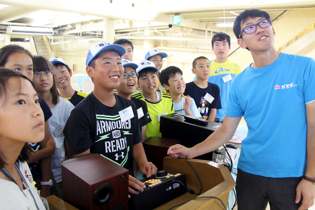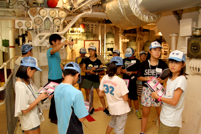 8月2日(火)午前、日本郵船(株)の歴史博物館として横浜市の山下公園に係留されている「氷川丸」を見学。クイズを交えながら船の仕組みや船員の仕事などについて学んだ後、操船シミュレーターを体験したり、航海計画を立てる体験をしたりしました。