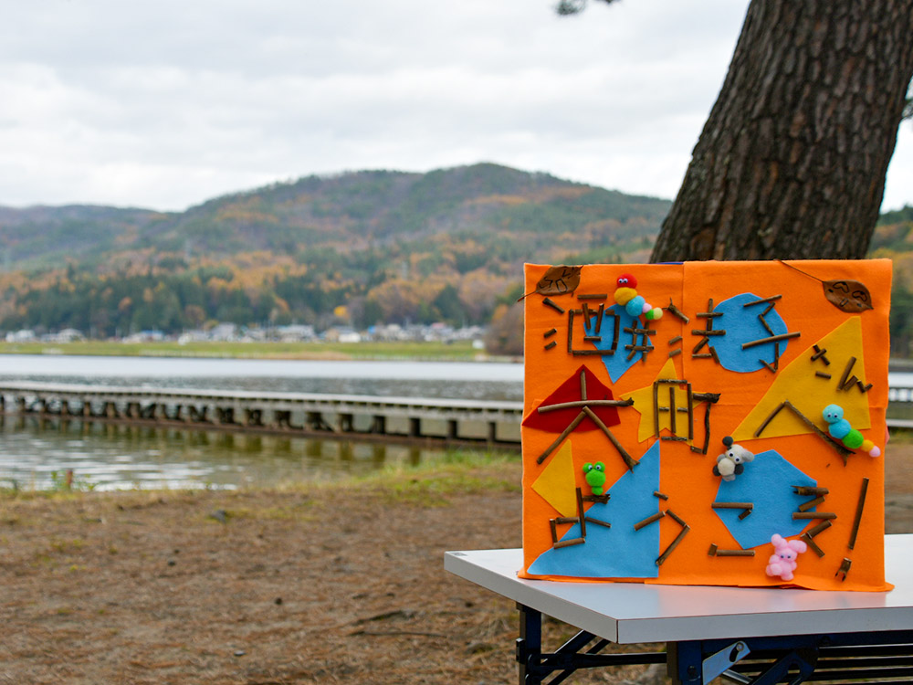 紙芝居「かっぱのふうちゃん」は、ライフジャケットの着用の重要性を、子どもたちが覚えやすい合言葉を用いて展開される。水辺で遊ぶ子どもたちの命を守ることをモットーに製作された作品である。拠点の子どもたちは夏場になると、木崎湖の水面でマリンスポーツも体験する。水辺の活動があるからこそ、再度ライフジャケットの大切さを学んだ。