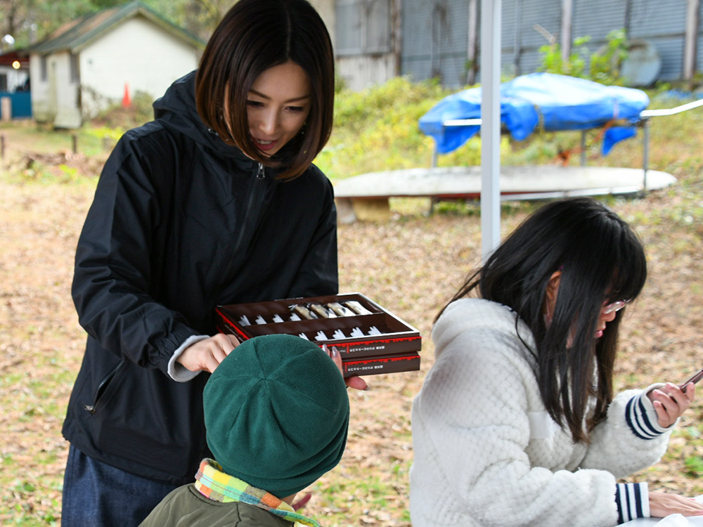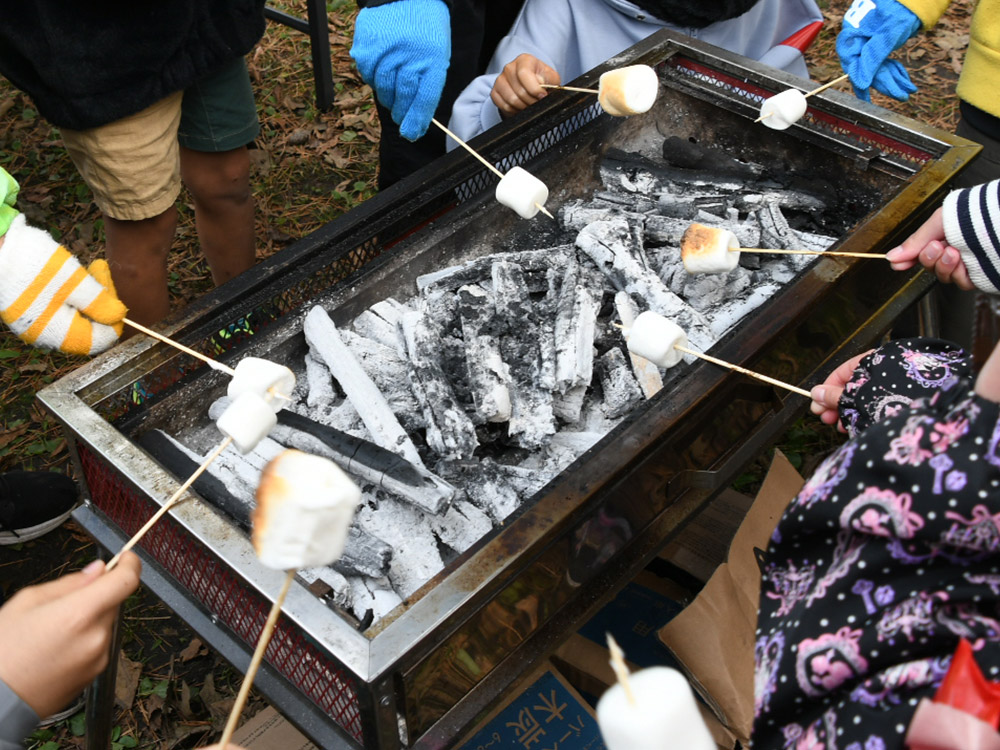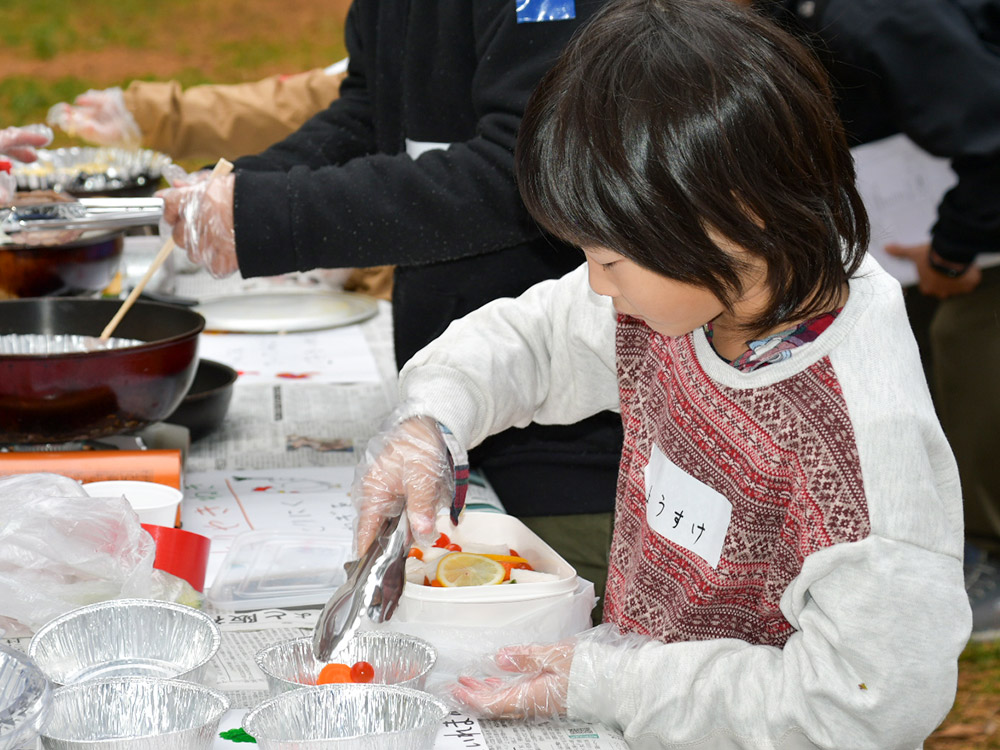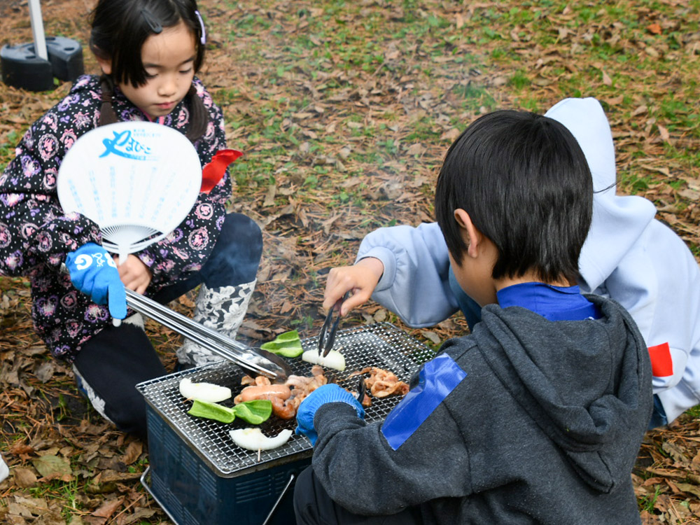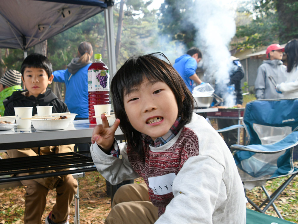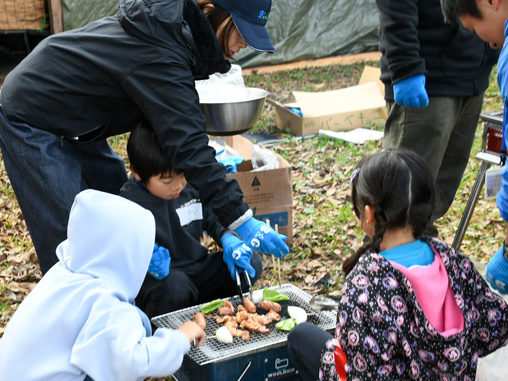 今回の活動は、外遊びやBBQにはじまり、酒井氏による紙芝居の朗読、落ち葉を使ったリース工作のプログラムを企画。昼食のBBQは、参加者全員で準備を行った。火起こし体験では、着火に四苦八苦する子どものたちの姿があり、一方では、拠点スタッフらにならって真剣に盛り付けと下準備に励む姿があった。酒井氏も下準備はもちろんのこと、モクモクと煙が立ち込める中、終始子どもたちと一緒にお肉や野菜を焼いた。そして、焼けたお肉を頬張る子どもたちを優しいまなざしで見守っていた。