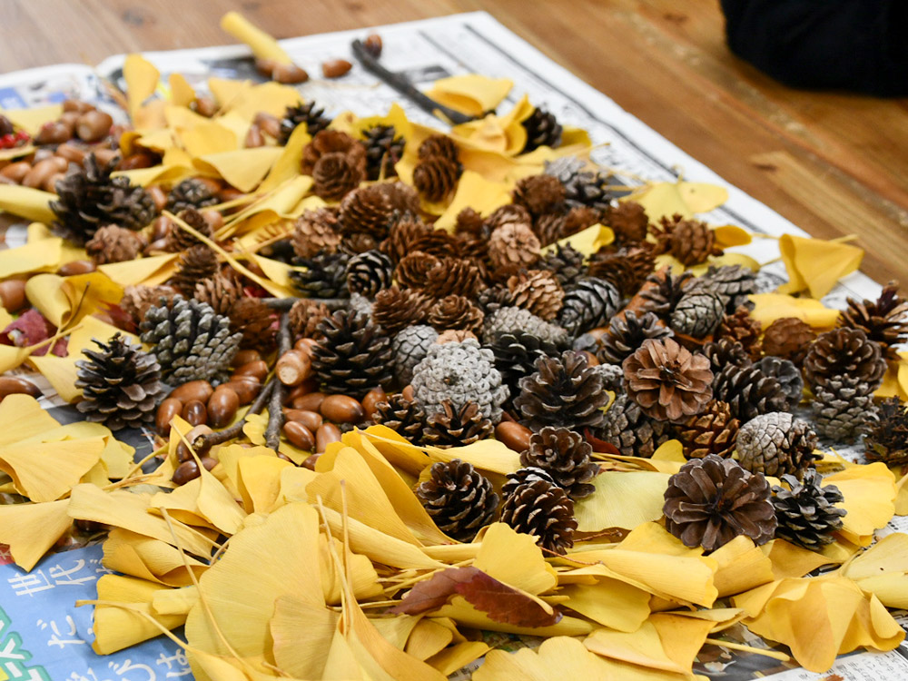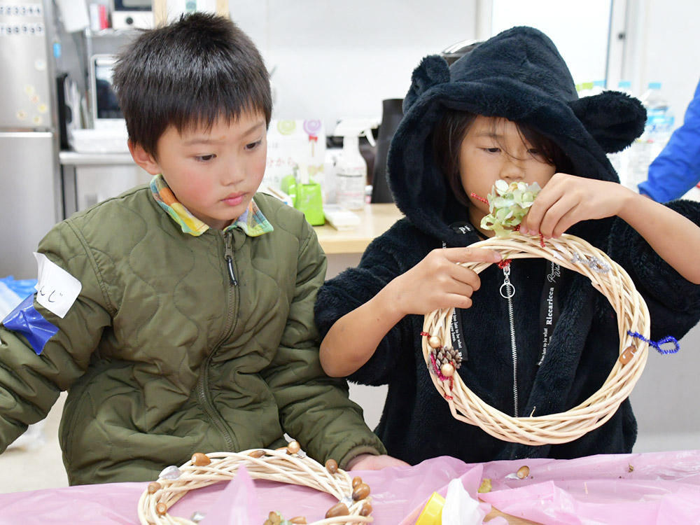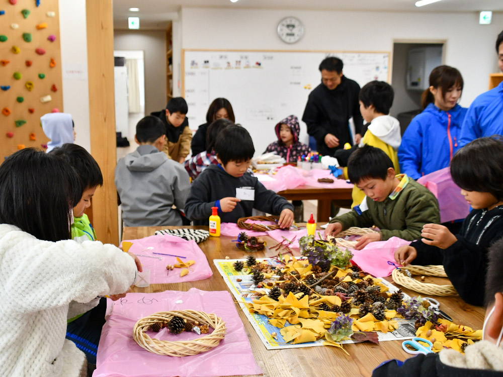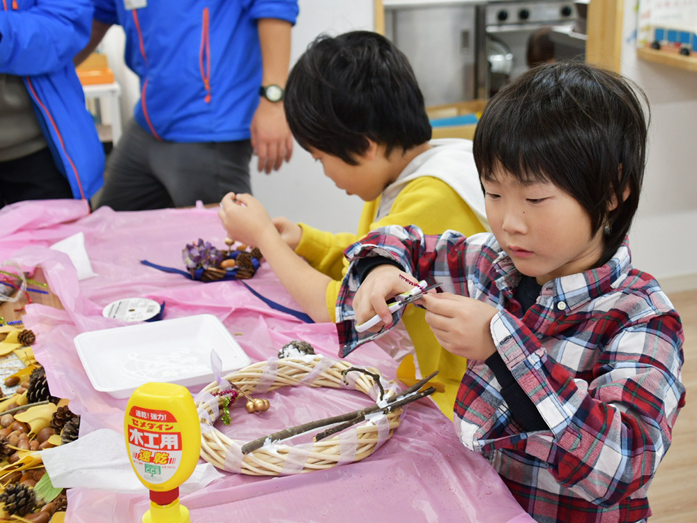 活動の最後には、拠点での「落ち葉を使ったリース工作」を行っている。それぞれが思い思いの作品を仕上げる中で、子どもたちの豊かな感性が発揮されていた。