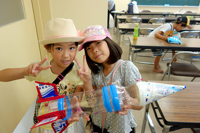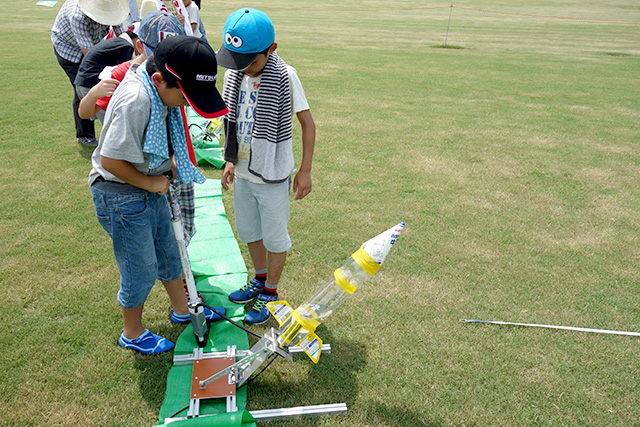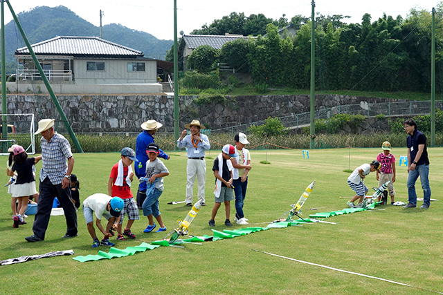 子どもたちが一番盛り上がっていたプログラムが、ペットボトルロケットづくりです。三木海洋クラブで長年活動しており、かがわ宇宙教育推進協議会にも所属している小松氏が指導してくださいました。2人1組で1つのオリジナルロケットを協力して作製。完成後は広大な芝生のサッカー場で、どれだけ遠くに飛ばせるか競い合っていました。最も飛んだ記録は、なんと71メートル!打ち上げに失敗した際は、「次はこうしてみよう!」と子ども同士で改善策を相談しながら、積極的に取り組んでいる姿が印象的でした。