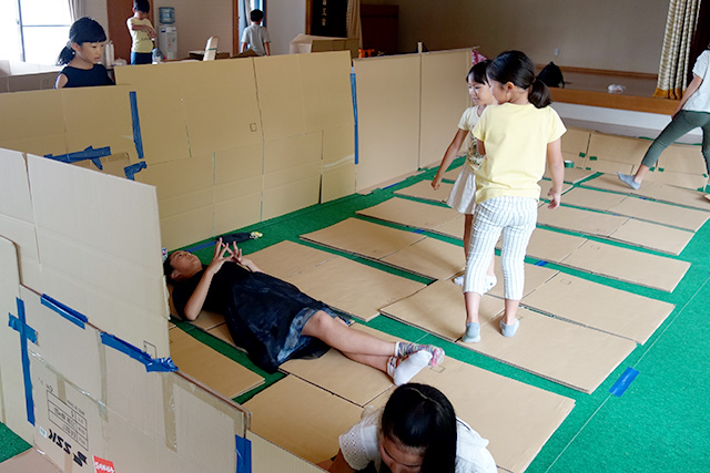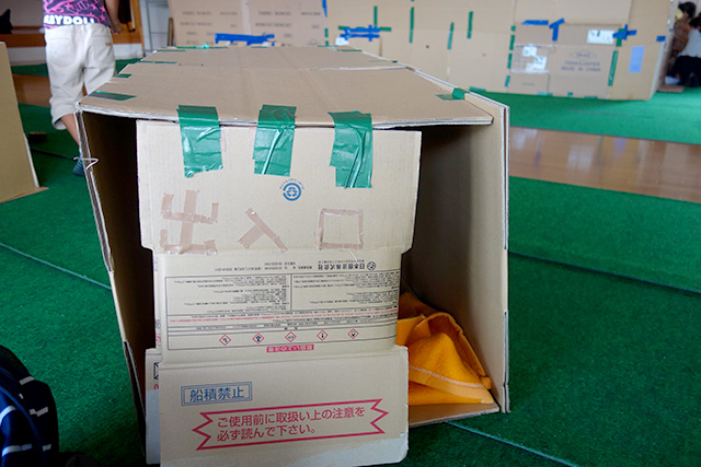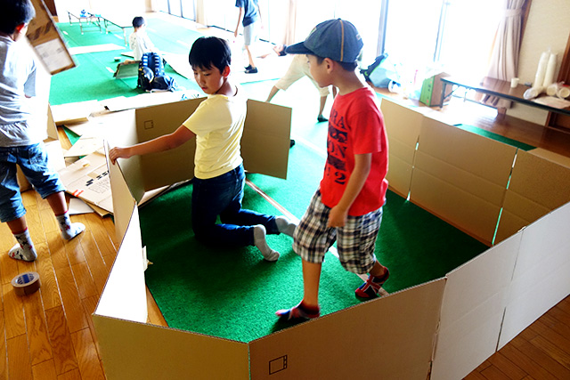 BG塾の4日目は、親元をはなれてどきどき宿泊プログラム!自分たちの寝床を、段ボールを使って子どもたちが思い思いにつくりました。女子はみんなで協力し、出入り口を作ったり、壁にイラストを描いたりしていました。それに対し、男子は自分たちの陣地を確保するところから始まり、セキュリティのカードを手作りするなど、様々な工夫が見られました。