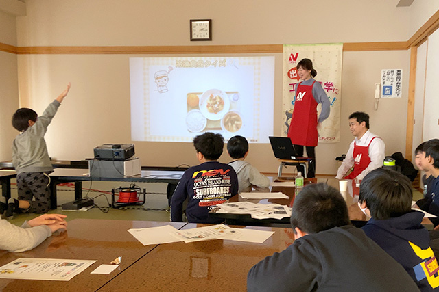 (株)ニチレイフーズ白石工場の社員さん方にご協力いただき、町内の文化会館にて出前講座を行いました。動画とスライドを用いて、冷凍食品が出来るまでの製造工程を分かりやすく紹介していただきました。工場見学では見られない工程の動画を見たり、冷凍食品に関してのクイズが盛り込まれていたりと、子どもだけでなく、大人にとっても非常に勉強になる内容となっていました!ニチレイフーズは全国に15ヶ所工場を所有していますが、出前講座は近くに工場がある地域であれば基本対応可能とのことです!そうでない場合も応相談!興味のある方は、是非お問い合わせください。