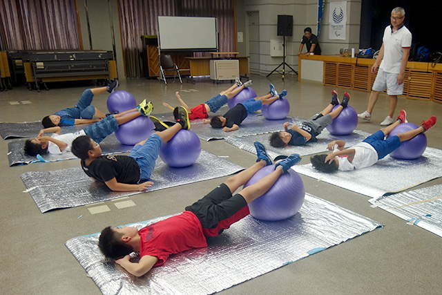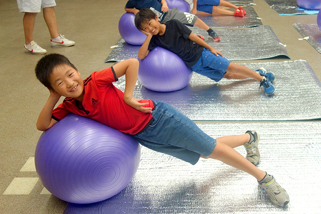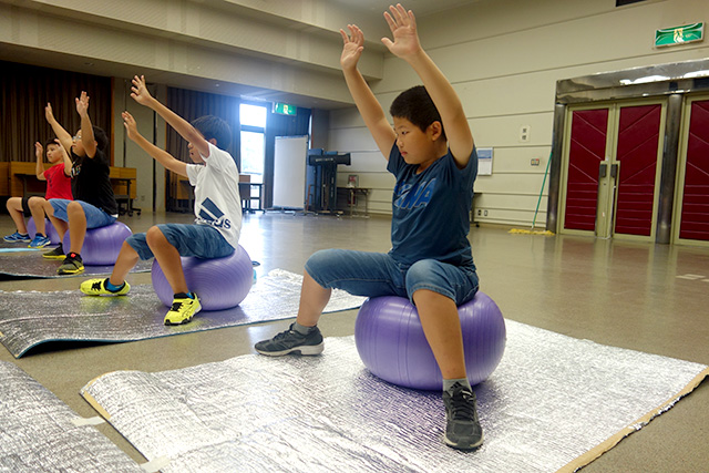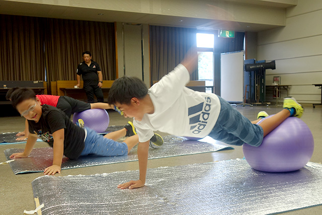豊後高田市ではスポーツにも力を入れています。スポーツを続けていくために怪我をしにくい体づくりの一環として、体幹トレーニングを市内の高校で実施しています。今回は小学生も挑戦してみよう!ということで、元プロ野球選手の山尾氏に指導してもらいながら、バランスボールを使ったトレーニングを行いました。ボールの上でバランスをとったり、腹筋を鍛えるために足でボールを動かしたりとなかなかハード!わいわい楽しみながら一生懸命取り組んでいました。
