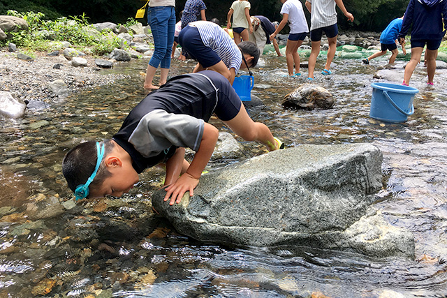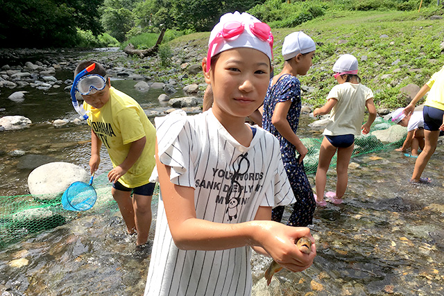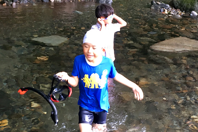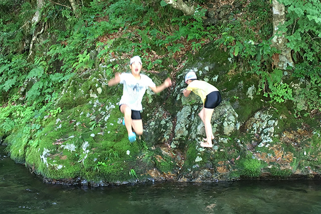 イワナのつかみ取りの後は川遊び。川の流れに身を任せて泳ぐ子、スノーケルをつけて水の中に顔をつけて魚を探す子、岩場からジャンプし飛び込む子。さじっ子はみんな、元気いっぱいです!ある女の子は「冷たい、寒い、怖い」と言いながらも、何度もジャンプし川に飛び込んでいました。