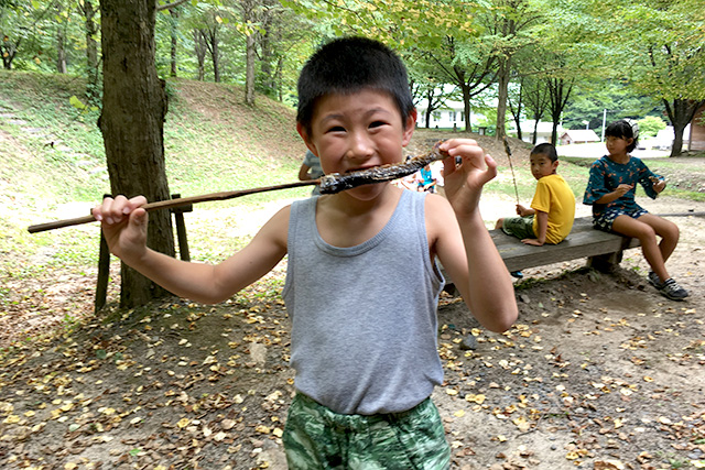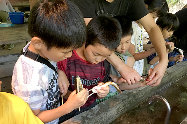 そして、頑張って捕ったご褒美、イワナの塩焼きでランチタイムです。指導員から、魚のはらわたの取り方を教わり「包丁を使わなくても、箸2本でとれるんだあ」と最初は気持ち悪いと言っていた子も夢中になって箸を動かしていました。身近な自然の中で、自分で捕まえて、自分で調理して、食べる、日常ではなかなかできない経験は、今年の夏休みのいい思い出となったのではないでしょうか。