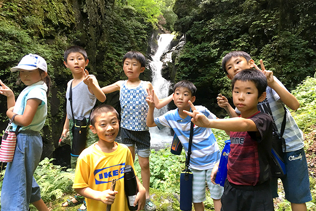 その後は、秘境「山王滝」を目指して探検・散策です。猛暑の中、急な坂を抜けると、マイナスイオンたっぷりの「山王滝」にたどり着きました。都会のオフィス街の方にも届けたいほどきもちのいいマイナスイオン・・・大人も子どもたちと一緒に癒されました。