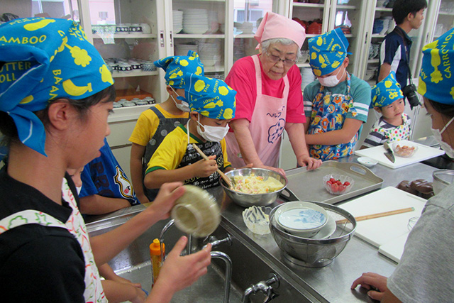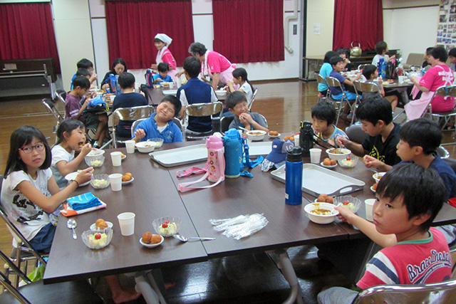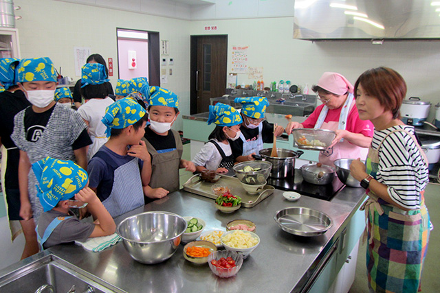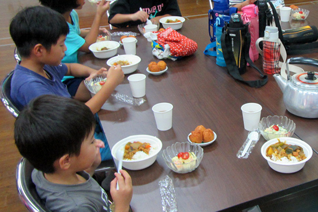 BG塾4日目は、地元の婦人会のご協力のもと、「自分たちのお昼ごはんは自分たちで作ろう!子どもお料理教室」です。この日のメニューは、大人も子どももみんな大好きカレーとポテトサラダです。婦人会の方々の指導の下、4班に分かれて子どもたち自ら調理を行いました。このお料理教室では、ただ調理して食べるではなく、食器洗いから後片づけまで子どもたち自身が行うということを大切にしています。作って、片付けるまでがお料理なのだということを学んでくれたようです。