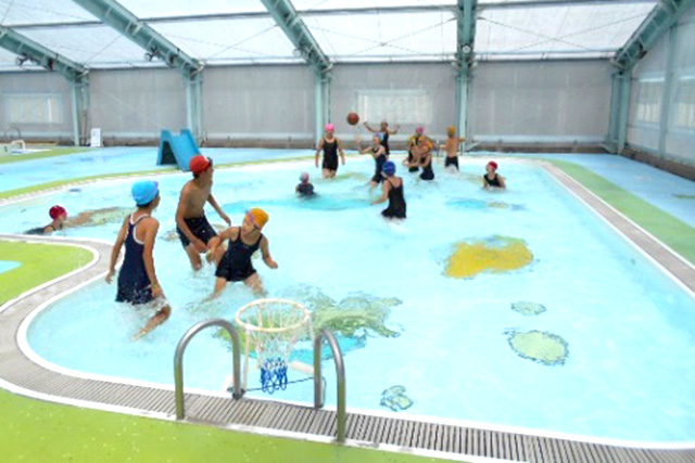 水中バスケットボールは幼児プールの入水階段にゴールを取り付け、ボールパスでゴールを狙います。プールで行うのでドリブルはできませんが、膝下が水に浸かっているので移動するにも負荷がかかり、かなりの運動量になります。