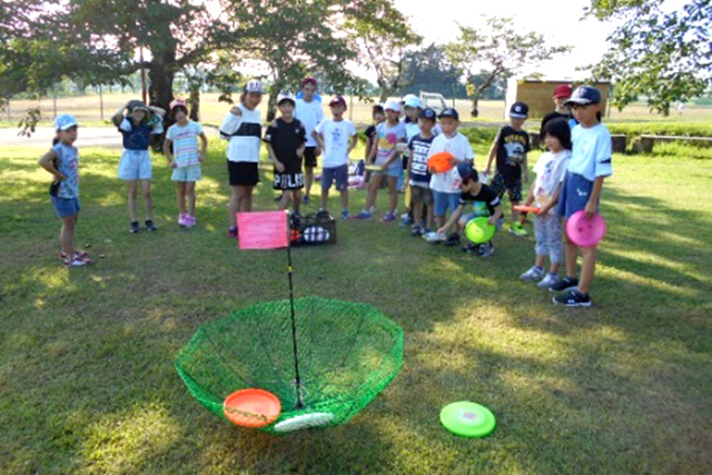フライングディスクは低学年でも一投で入るように距離を短くし、チーム全員が一回ずつ投げてゴール数で競う対抗戦にしました。小学1年生がゴールするとチームは大いに盛り上がり何度も繰り返し楽しんでいました。そのほかバランス感覚や集中力を鍛えることができるスラックラインにも挑戦しました。