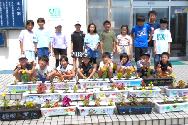 ガーデニングはプランターにいろいろな種類の花の寄せ植えを行い、利用者をもてなすウェルカムプランターとして正面玄関に飾りました。海洋センターがグッと明るい雰囲気になりました。