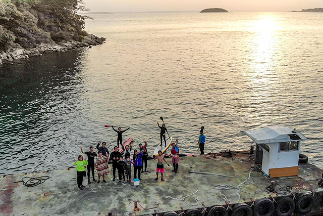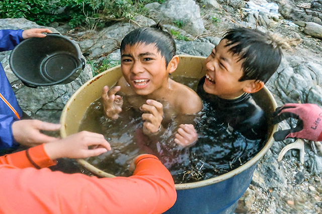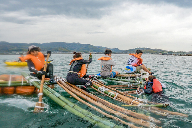 2日目は「いかだで無人島を脱走!」に挑戦。1.5キロ先の出発地点まで、悪戦苦闘しながらも、手作りのいかだとパドルを漕いで戻りました。子どもたちは「火起こし、ドラム缶風呂、キャンプファイヤー。全部いい思い出になった」と大絶賛。子どもも大人も大満足の体験活動となりました。