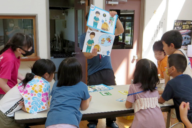 防災教室では防災紙芝居(PDF形式/8.8MB)を活用して、地震や大雨に遭ったときの行動について意見を出し合った後、防災カードゲーム「なまずの学校」をグループに分かれて行い、災害時に発生する様々なトラブルの解決方法について話し合いました。