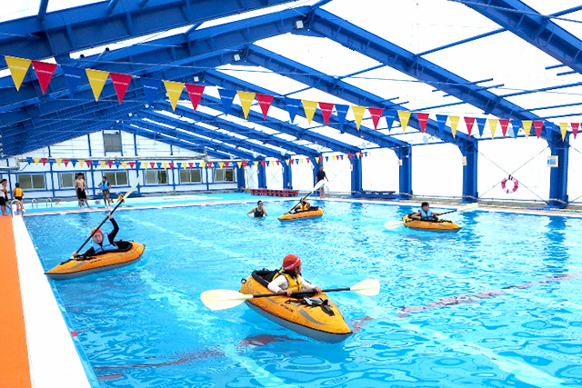 カヌー教室は松山海洋センター指導者会の協力を得て、プールでカヌーにチャレンジ。初めての子供もすぐにコツをつかみ、全員笑顔でパドリングを楽しみました。