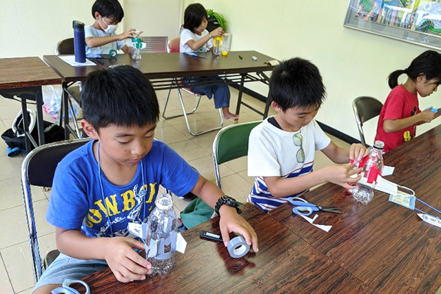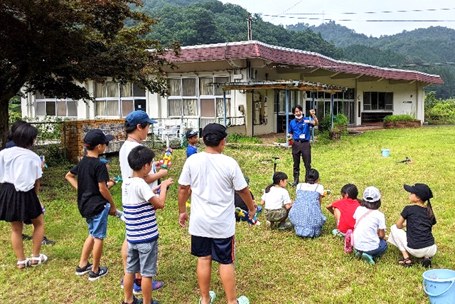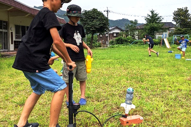 鳥取市佐治地区は、日本一美しい星空の見える場所にも認定されたことのある地域。地区内にある「さじアストロパーク」の研究員の協力を得て、星や宇宙、ロケットの話などを交えながら、ペットボトルを使ったロケットをつくり、発射実験を行いました。
