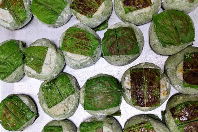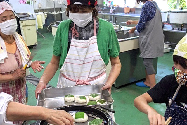 昔ながらのおやつ作りにも挑戦。「婦人の家」の職員の皆さんに協力いただき、郷土料理「かま焼き」をつくりました。ついた餅の中に餡子を入れ、ミョウガの葉っぱでくるんで焼きます。以前は旧暦6月15日の満月の日に食べていたそうです。往時のお話を聞きながら、昔の暮らしに思いを馳せました。