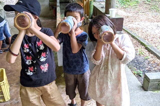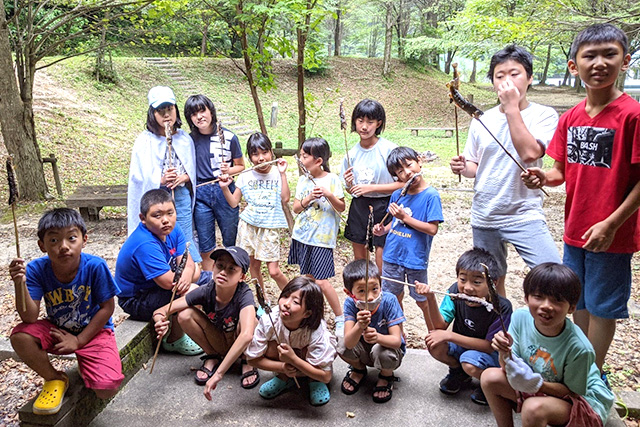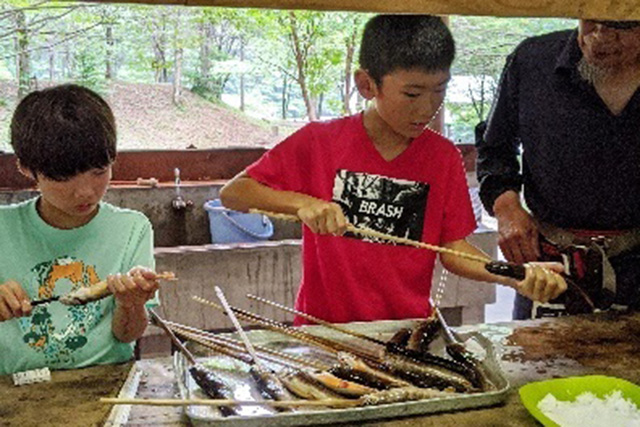 また、山王谷キャンプ場に出かけて、岩魚のつかみどりと竹工作にもチャレンジしました。岩魚のつかみどりでは、火起こし、腹を裂かないはらわたの取り方、串の刺し方など、講師から手ほどきを受けて子供たち自身で調理し、命を頂く体験を行いました。あわせてカレーをつくり、飯盒炊飯を行う中で、薪の火加減の難しさを体感しました。