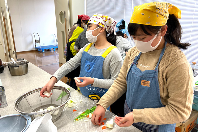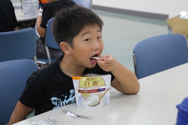 【内容】 町内に焦点を絞った防災教育をスライドで実施したのち、防災を意識したカレー&プリンづくりを行いました。鍋でご飯を炊き、キッチンバサミやラップを包丁・まな板代わりにしました。参加者は協力し合って取り組んでいました。 【講師・サポーター】 町総務課、大学生 |
