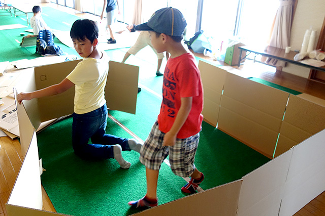【内容】 災害時の避難場所での生活を、子どもに意識付けることを目的に実施しました。子どもたちは段ボールとガムテープをうまく使いながら、協力し合って作成していました。 【講師・サポーター】 スポーツクラブスタッフ |