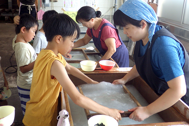 【内容】 和紙製造会社に出向き、和紙すき体験を行いました。和紙すきが営まれた経緯や、働く方の思いなど貴重な話も聞くことができました。参加者は和紙ができるまでを目の当たりにし、道具や手さばきに驚いていました。 【講師・サポーター】 桂樹舎 |