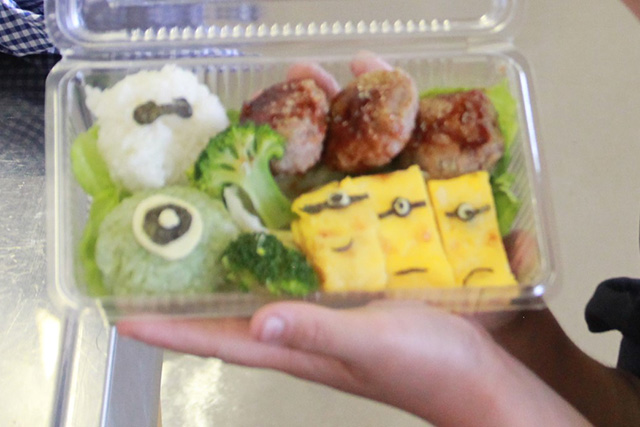 【内容】 子どもの興味のわくものをテーマに、ミニオンやベイマックスのお弁当を作成しました。 【講師・サポーター】 栄養士、地域のボランティア |