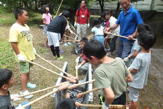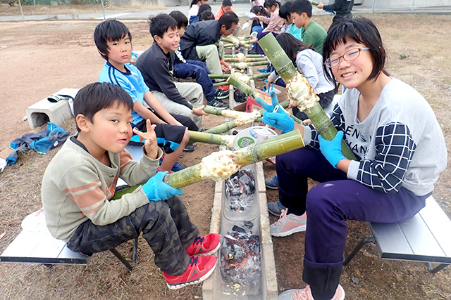 【内容】 島内の神社の竹林を借りて、竹切りから体験!軽トラックでセンターまで運んだ後、火おこし班と生地作り班に分かれて作業を行いました。1時間半程度でバンブークーが焼き上がりました。 【講師・サポーター】 センター職員 |
